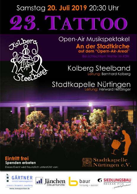 23. Tattoo Open-Air 2019 mit der Stadtkapelle Nürtingen und der Kolberg Steelband |